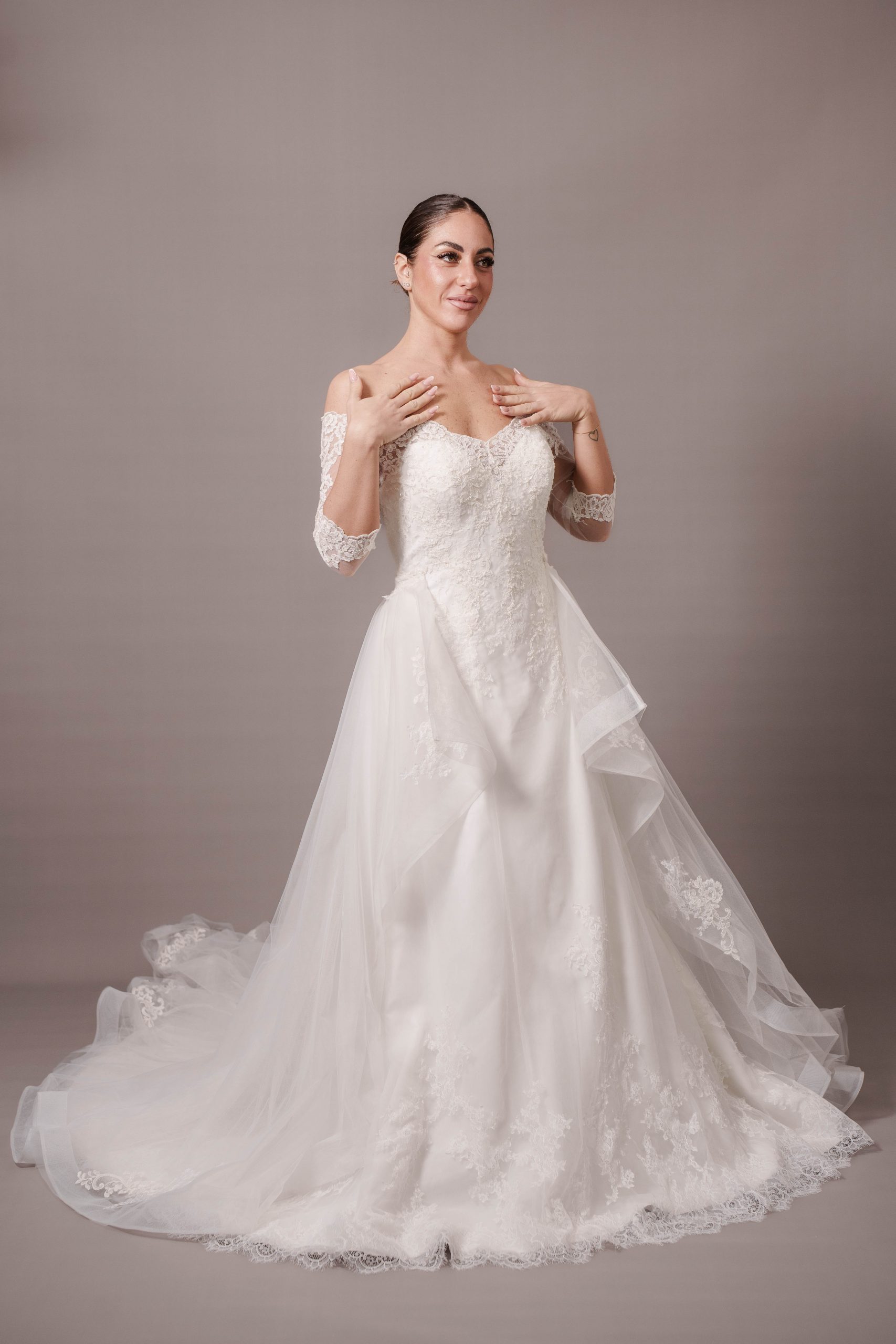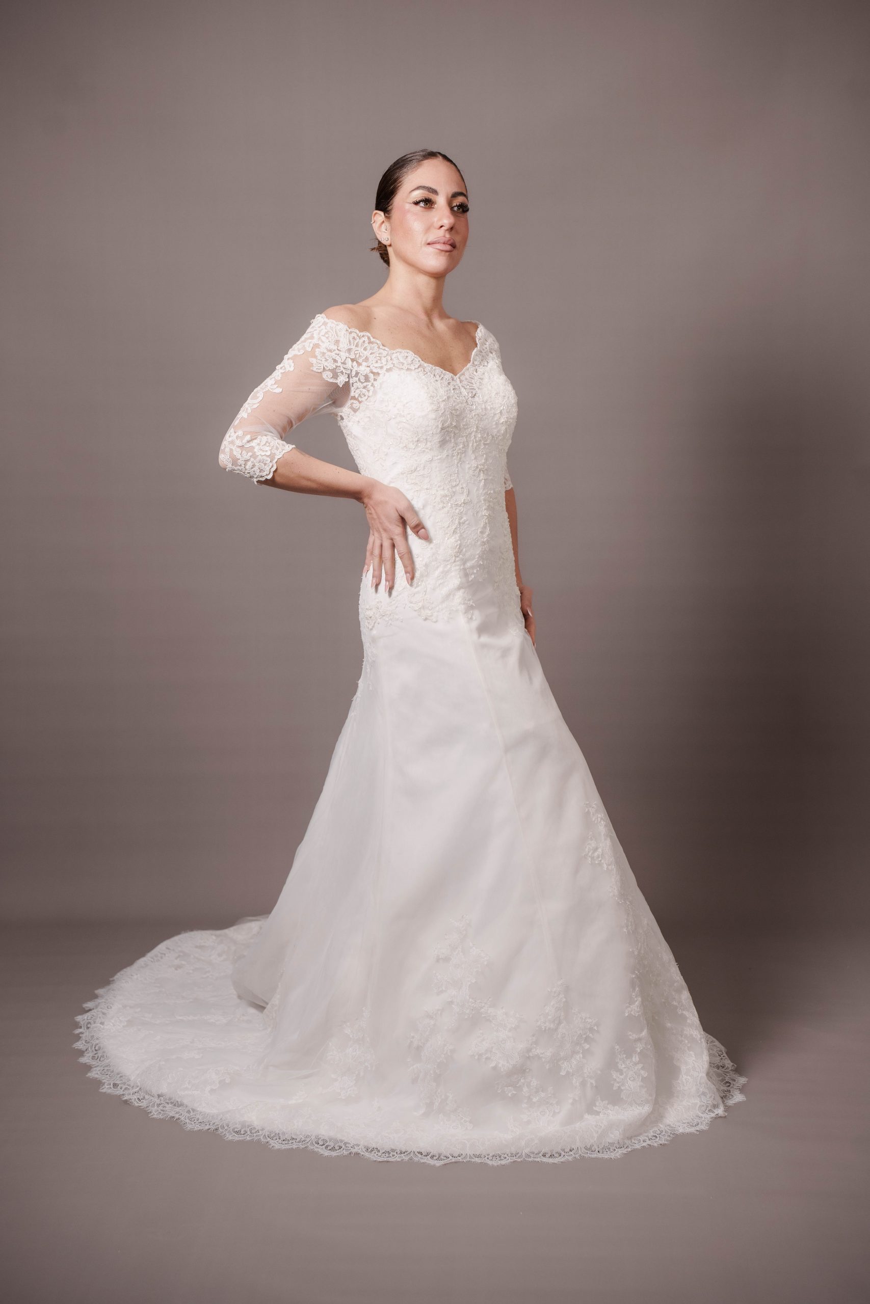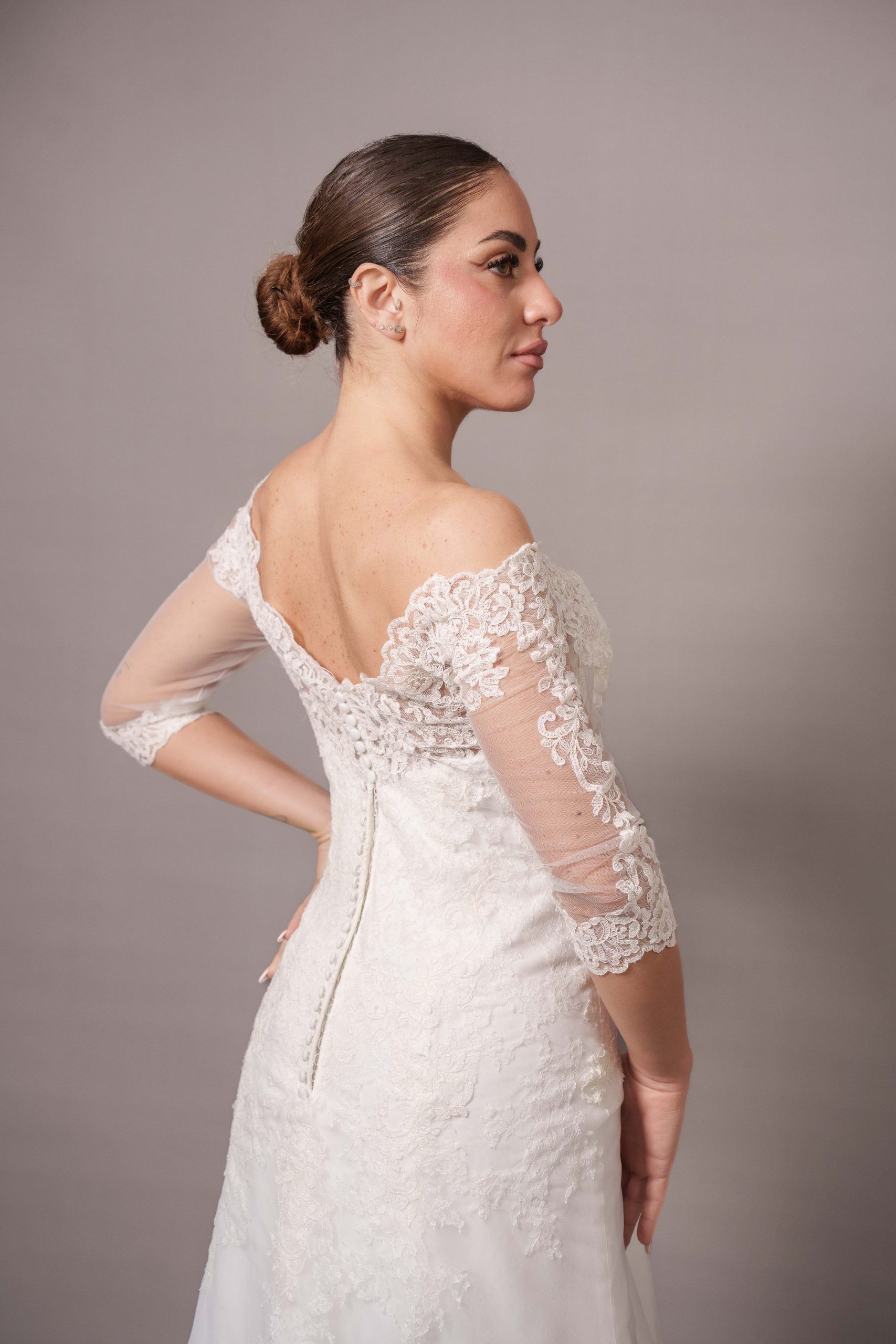 Taglia 48, per altre richieste, eventuali aggiunte e/o modifiche contattare l’atelier allegando la ricevuta di acquisto Presenta un leggero ingiallimento del pizzo