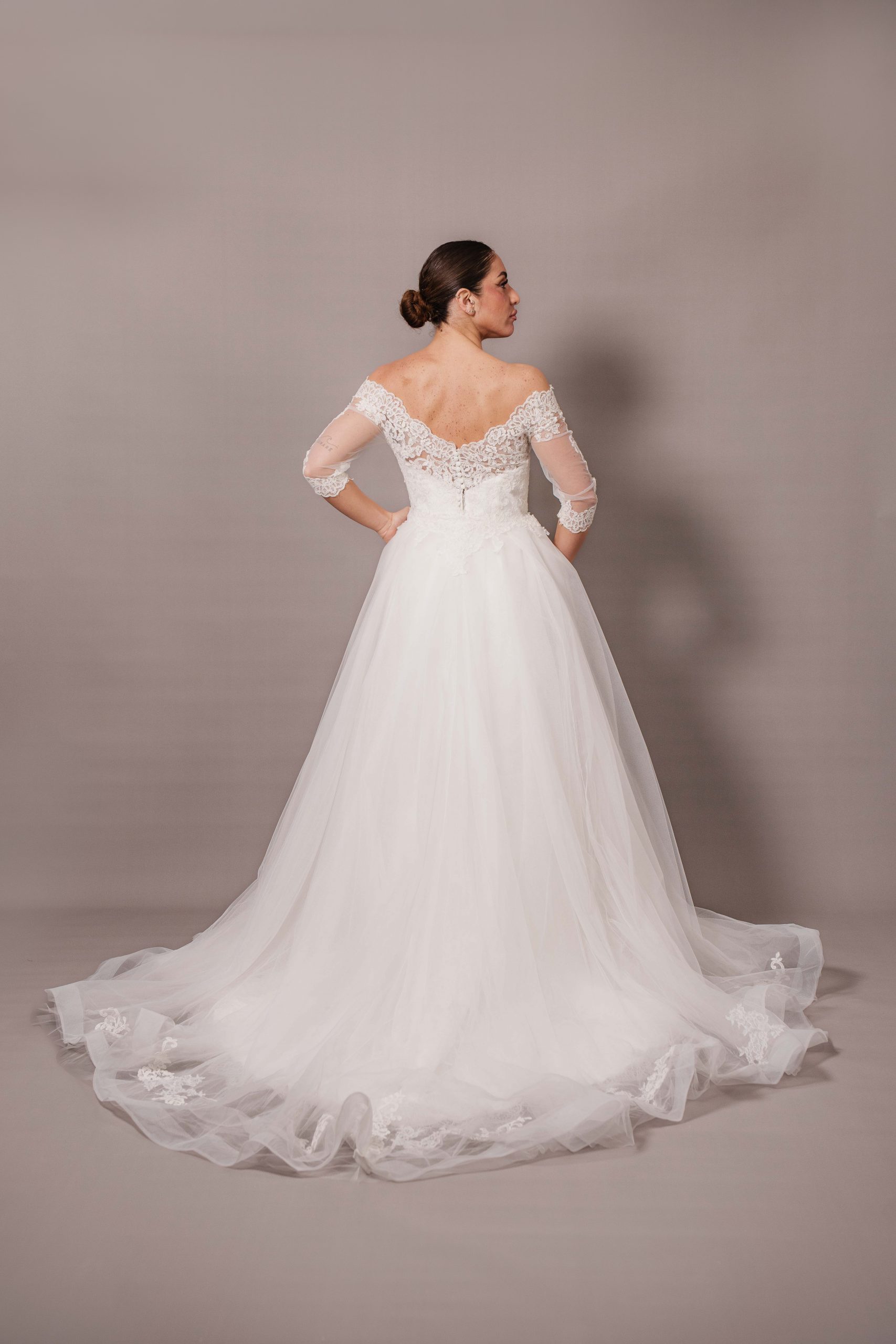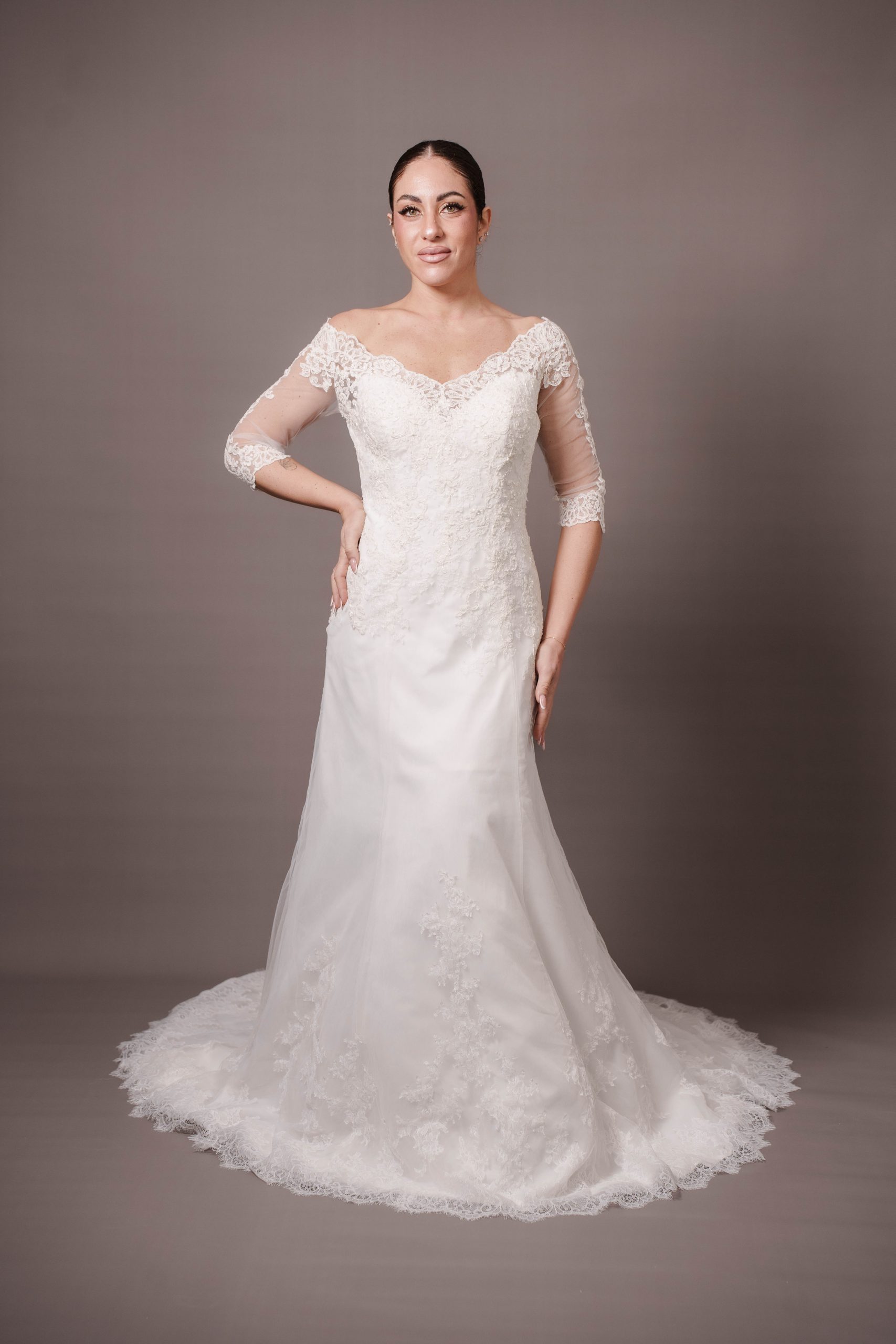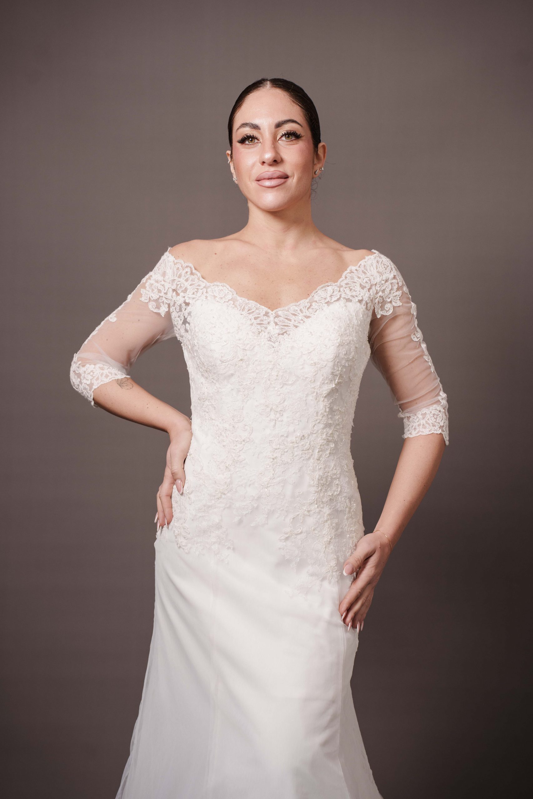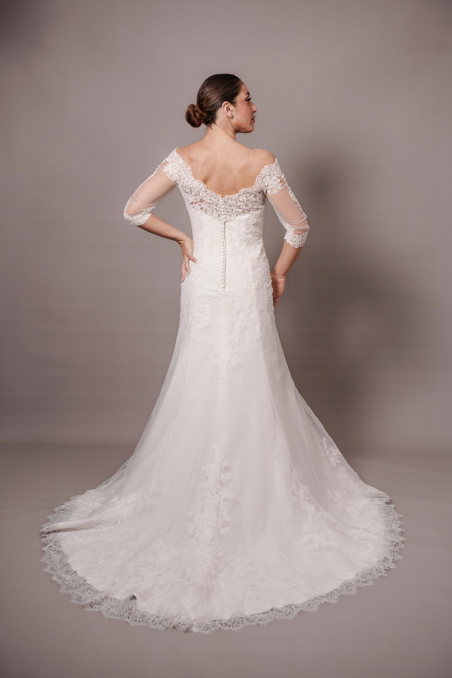 Taglia 48, per altre richieste, eventuali aggiunte e/o modifiche contattare l’atelier allegando la ricevuta di acquisto Presenta un leggero ingiallimento del pizzo